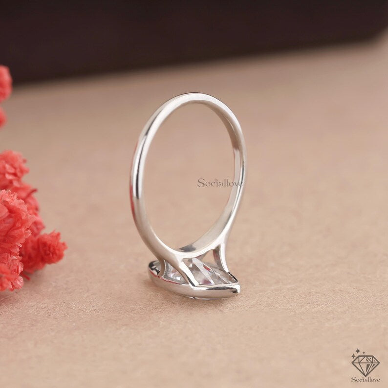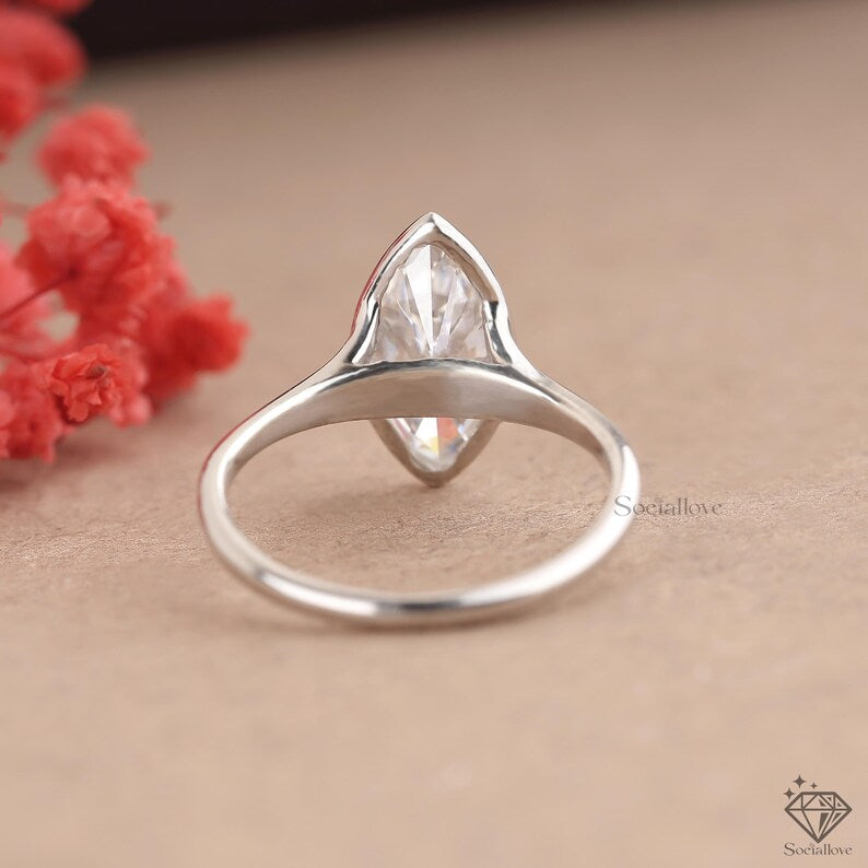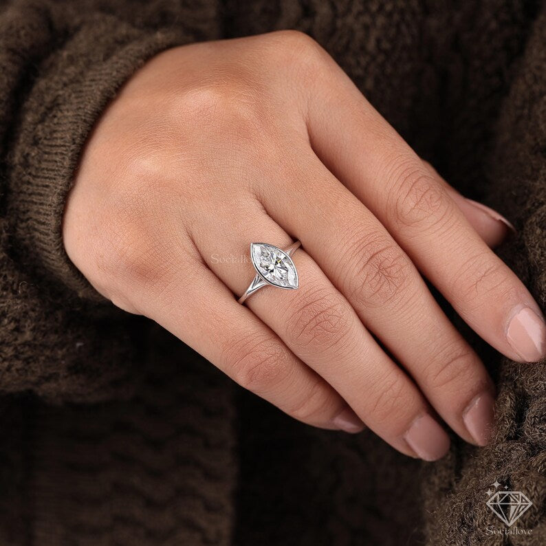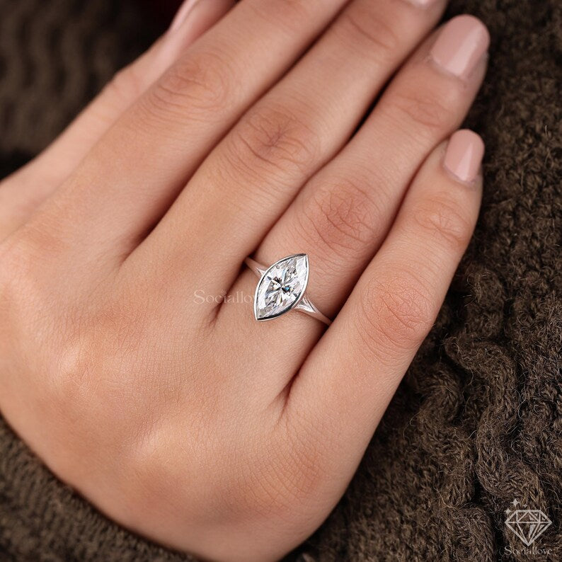 Marquise Lab Grown Diamond Engagement Ring | Bezel Set Solitaire in 14K White Gold | Modern Ethical Wedding Ring | Marquise Promise Ring for Her.