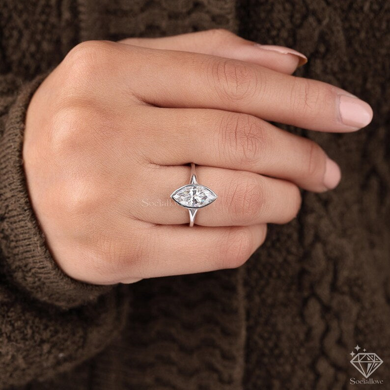 Setting: A secure Full Bezel Setting that entirely cradles the Marquise stone, protecting its delicate points and offering a smooth, snag-free surface. The East-West orientation (horizontal) of the stone is a chic and unique choice.
