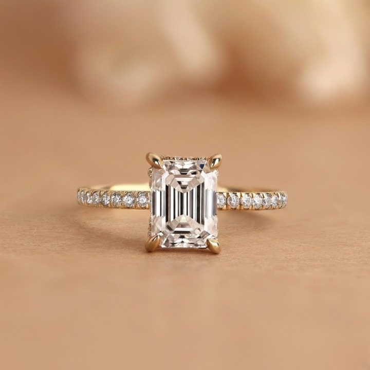 Emerald cut lab grown diamond ring with hidden halo and pave setting, crafted in solid 10k to 18k gold. We use the best handmade EFG color and VS/VVS1 clarity lab diamonds for a clean and bright look. Perfect for engagement or wedding. Order today to make it yours. Handmade by SUNDARAM JEWELLERS.