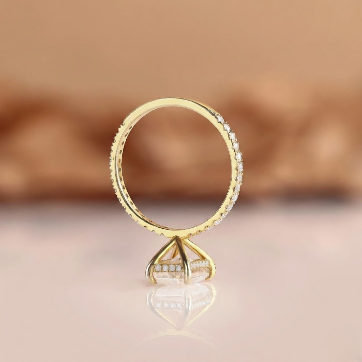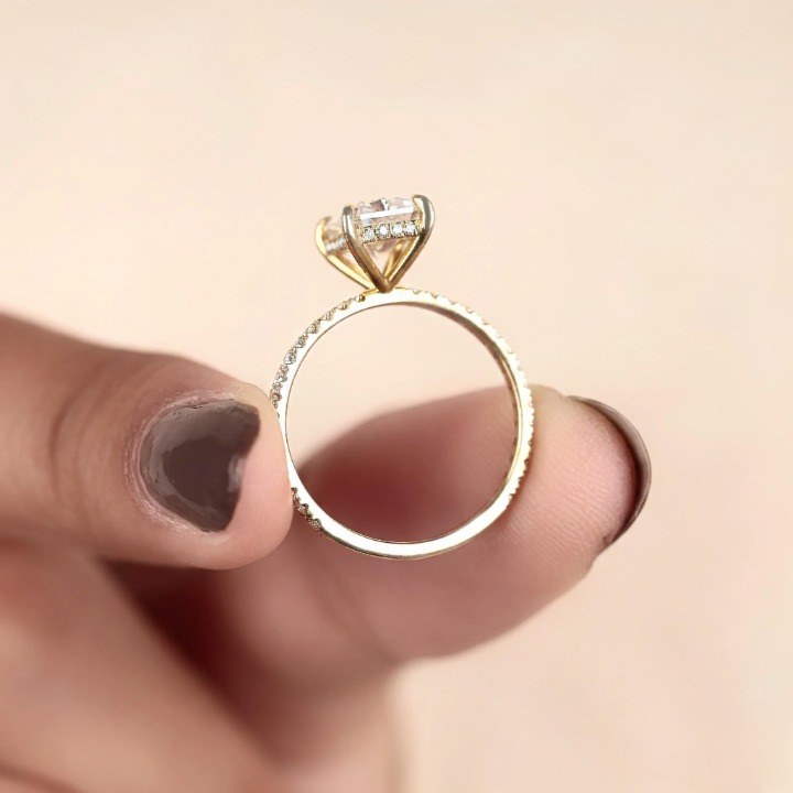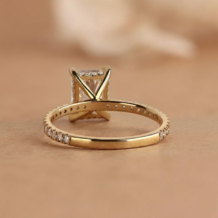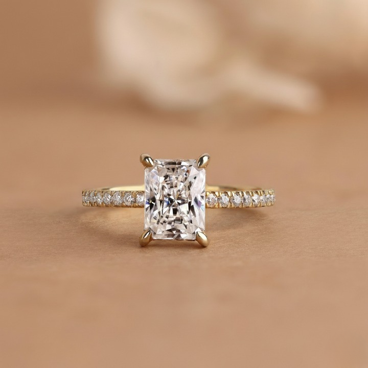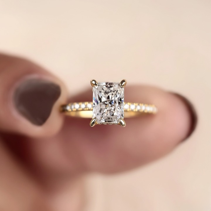 Radiant cut diamond ring with hidden halo and pave setting, crafted in 10k to 18k solid gold. We use handmade E-F-G color lab grown diamonds with VS or VVS1 clarity. Perfect for engagements or anniversaries. Order today for a meaningful and lasting piece. Handmade by SUNDARAM JEWELLERS.