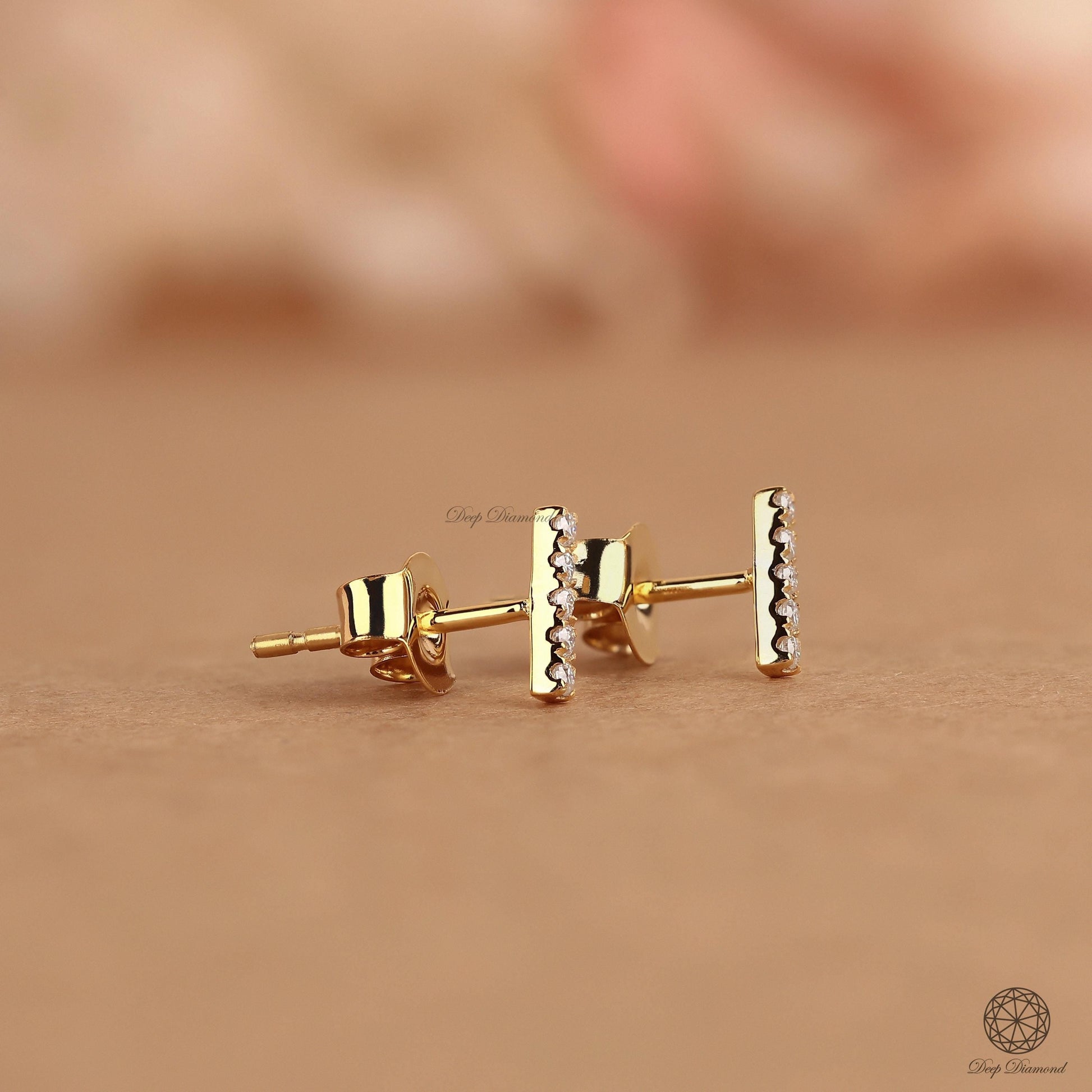 Diamond bar stud earrings featuring round lab-grown diamonds in a tiny vertical design. Handmade using EFG color and VSโ€“VVS1 clarity diamonds set in 10k to 18k solid gold. Available with push or screw backs. Order today and add a delicate sparkle to your collection.
