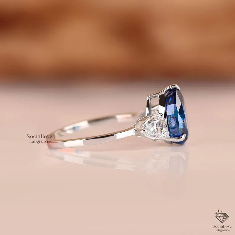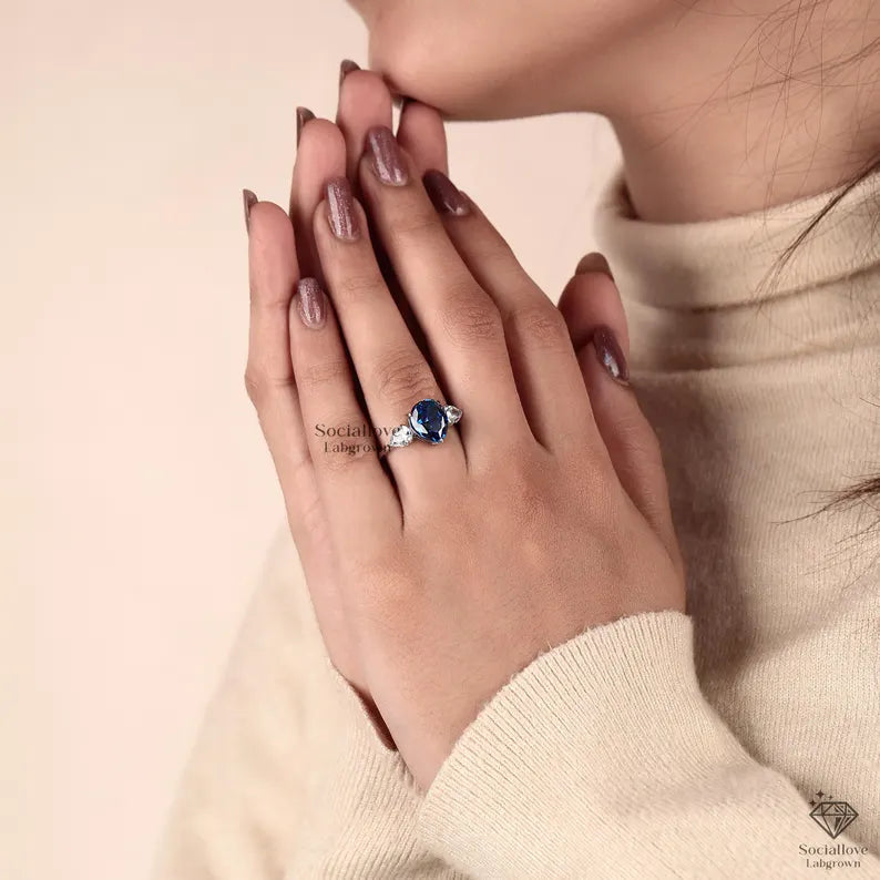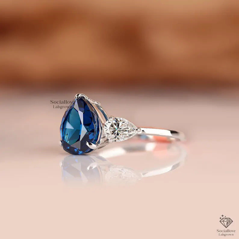 Capture the essence of the deep sea and clear skies with our Pear Cut Blue Lab Grown Diamond Ring. This exquisite three-stone design features a striking "Sapphire Blue" center stone, offering the regal look of a sapphire with the superior brilliance and durability of a diamond.