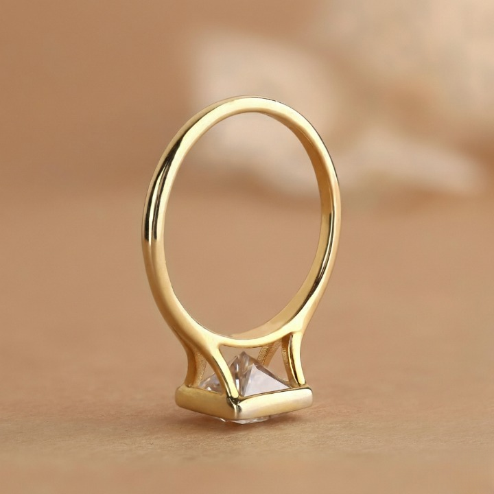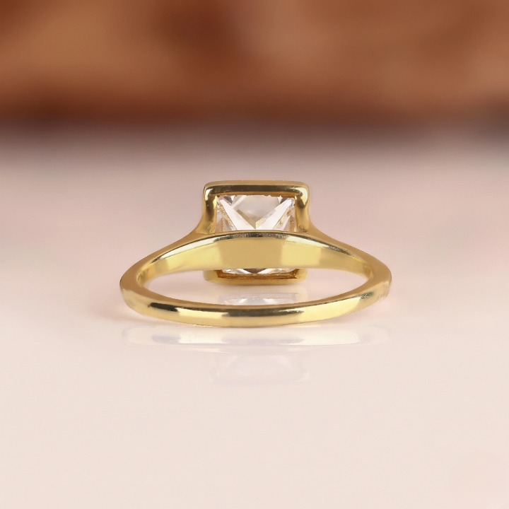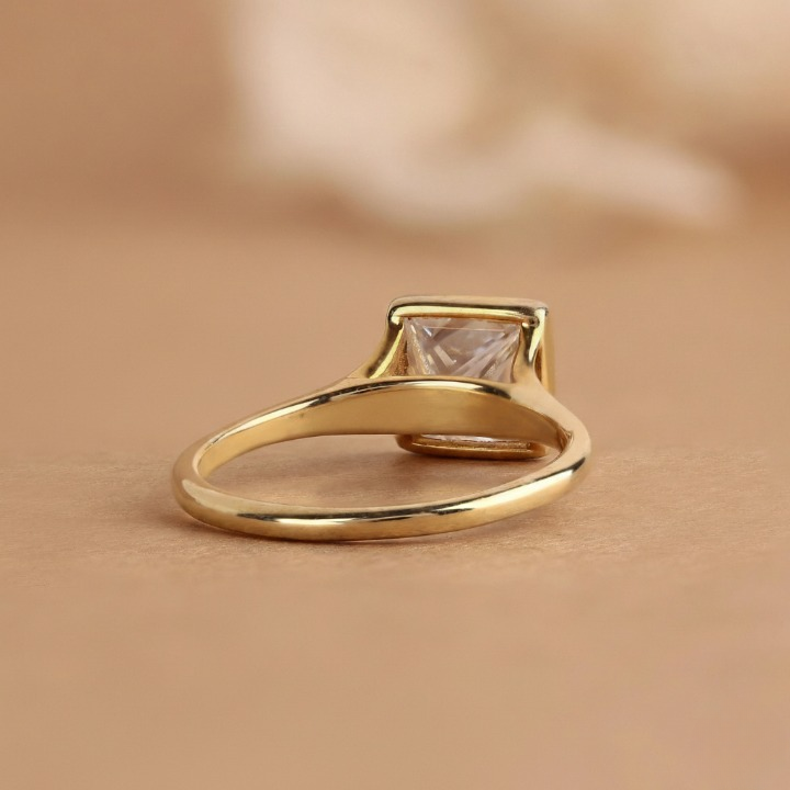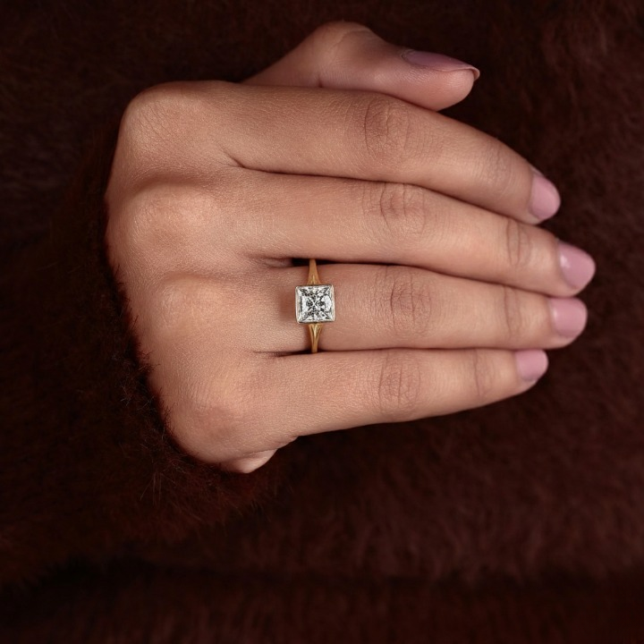 This Princess Cut lab grown diamond ring features a bezel setting with a split shank design in solid 10k to 18k gold. We use handmade diamonds in EFG colors and VS to VVS1 clarity for a clean, radiant look. A perfect choice for proposals or anniversaries. Order today and make it special.