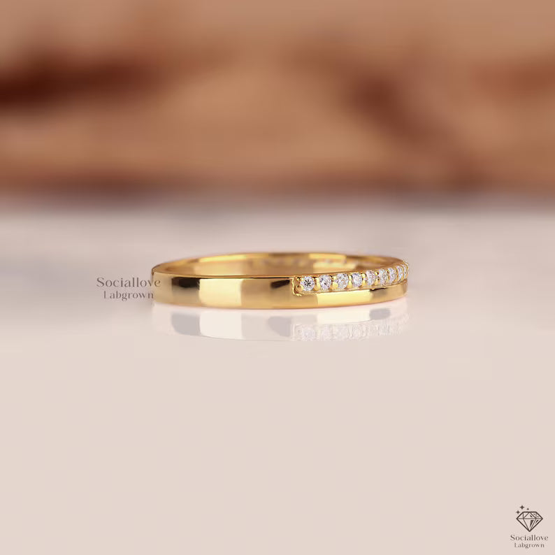 Elevate your everyday look with our Lab Grown Diamond Pave Half Eternity Band. Designed with a "One Side" diamond layout, this ring offers the radiant sparkle of a full eternity band on top, while the smooth solid gold bottom ensures a Comfort Fit that’s perfect for all-day wear.