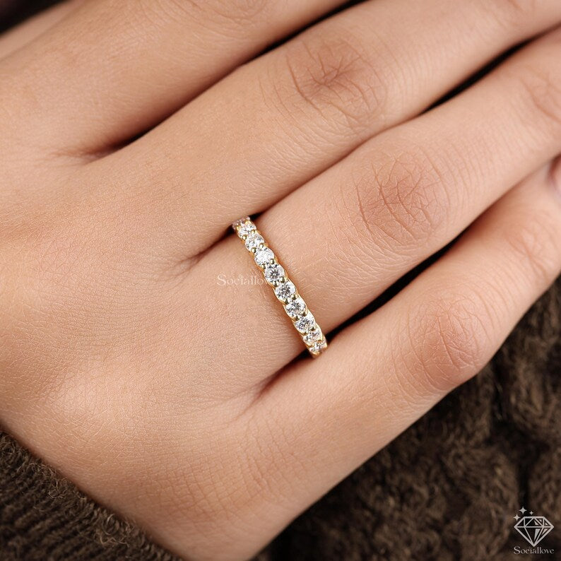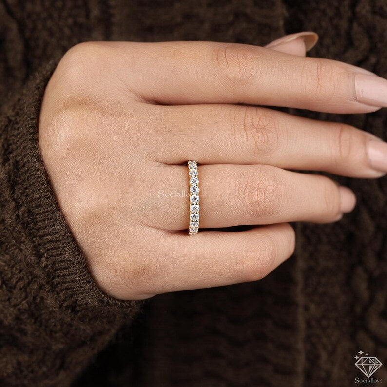 14k Yellow Gold U-Prong Round Cut Full Eternity Band Certified Matching Stackable Wedding Ring Thick Diamond Simulant Band Gift for her.