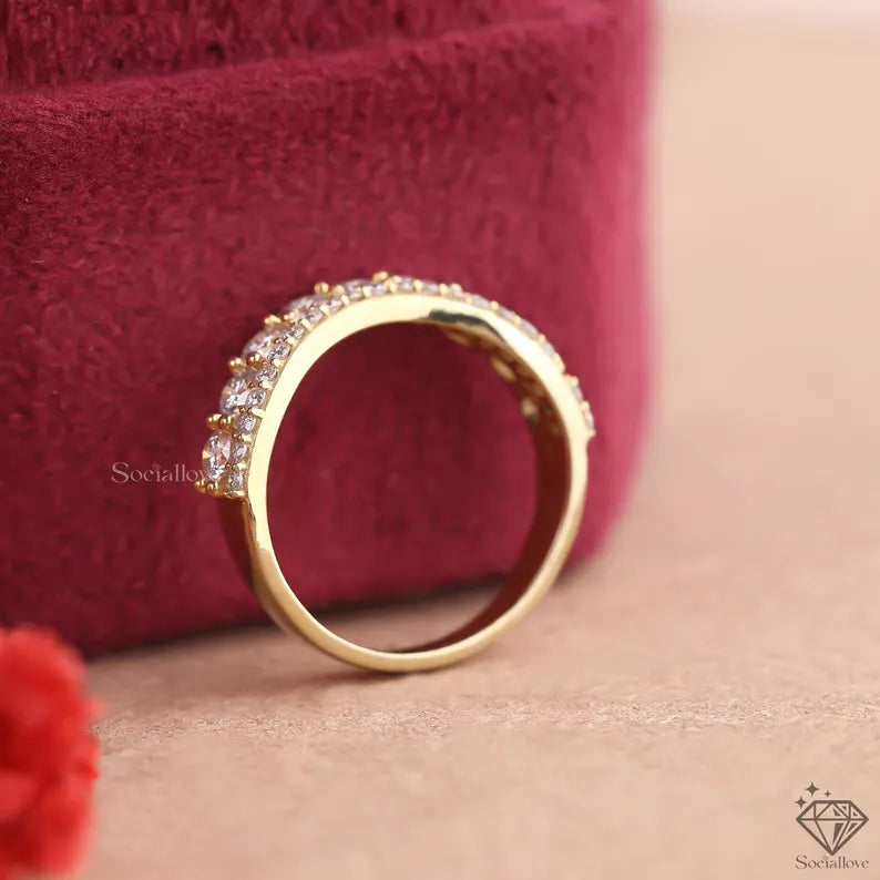 Setting: Double-Row Pavé Setting. The band features two distinct rows of brilliant round-cut lab grown stones set closely together, maximizing fire and brilliance.