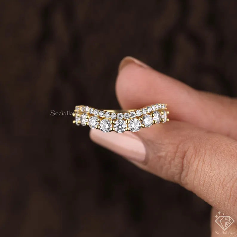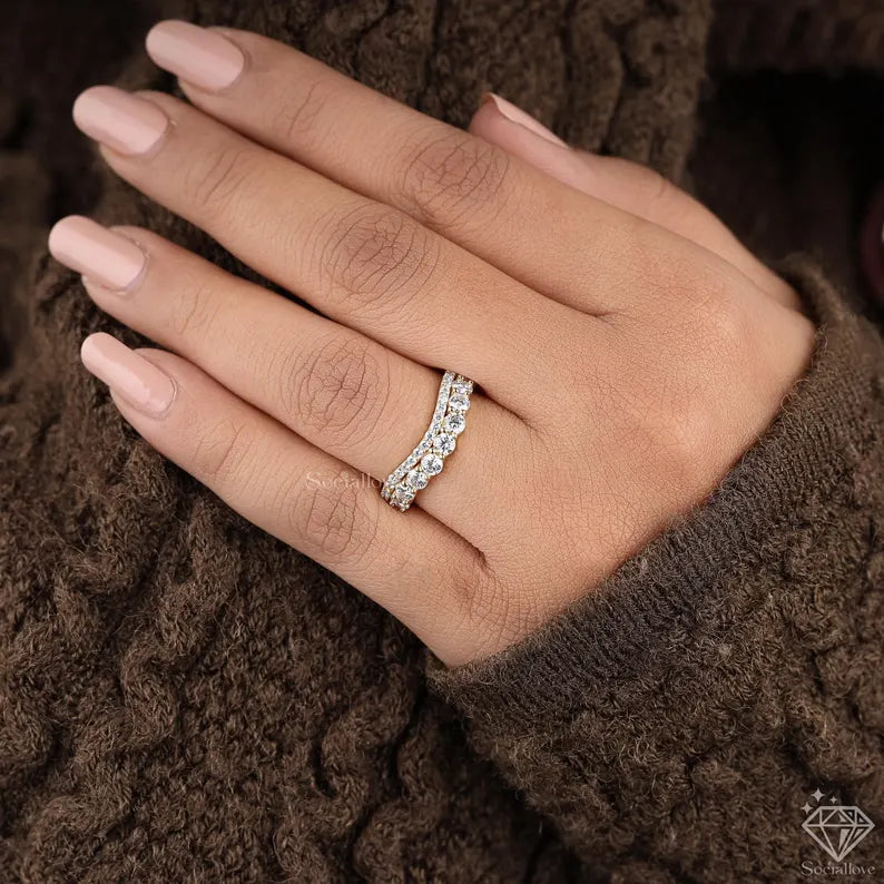 Certified Lab Grown Diamond Curved Wedding Band Double Row Contour Ring 14K Gold Stackable Chevron Guard Matching Anniversary Band for Her.