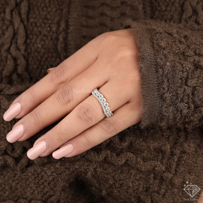 Bottom Row: Features larger stones in a Shared Prong or Scalloped Setting, creating a bold, continuous line of sparkle.