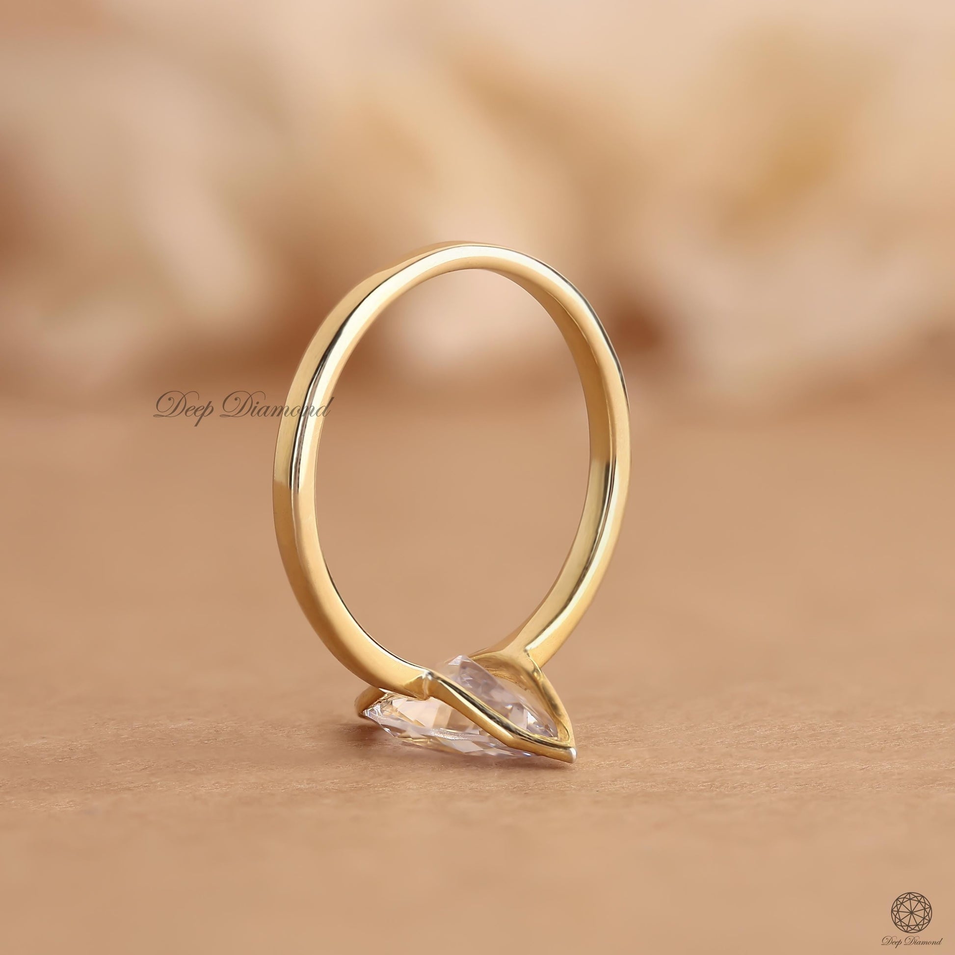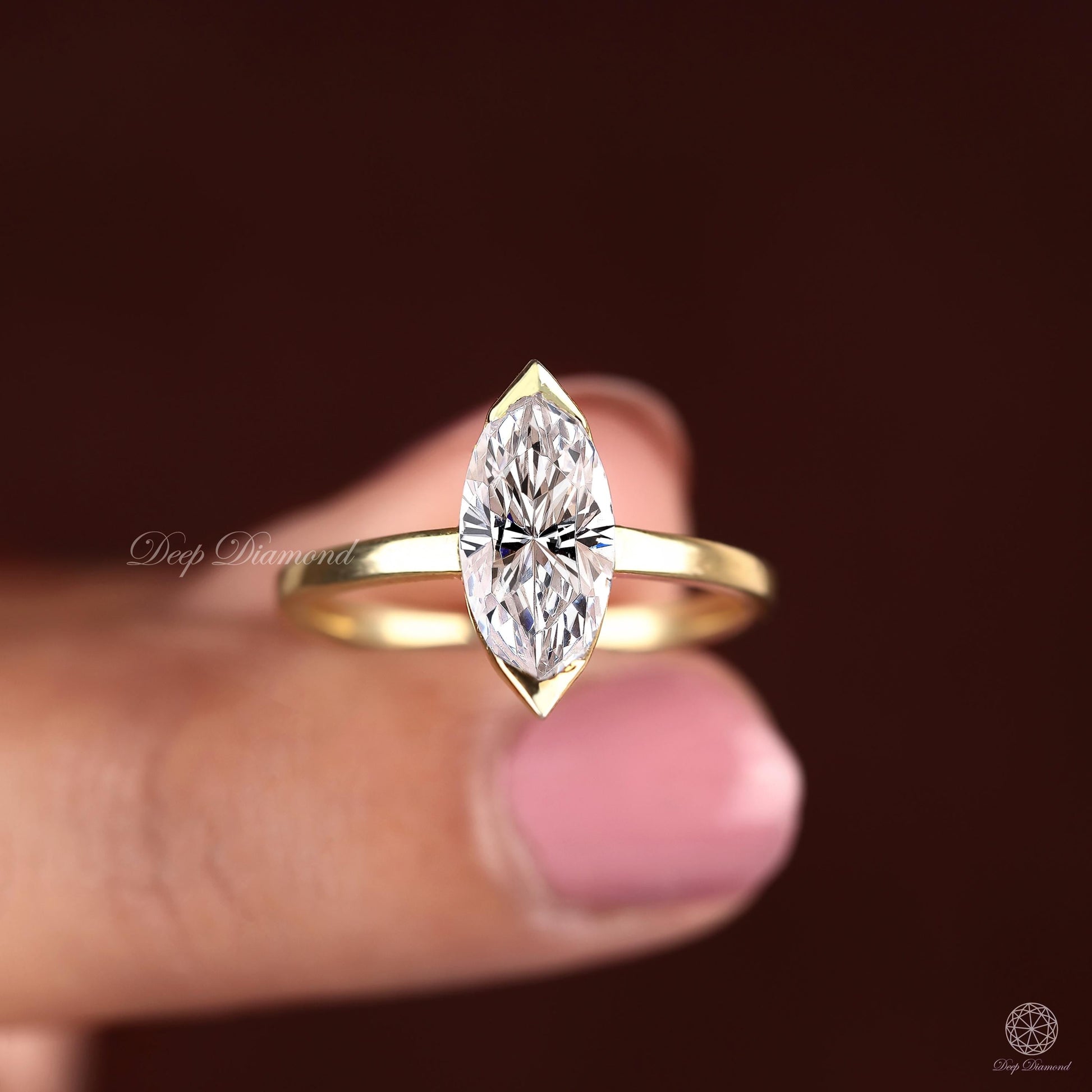 This marquise-cut lab-grown diamond ring features a sleek half-bezel setting, highlighting its brilliance. We provide the best handmade EFG color and VS/VVS1 clarity lab diamonds set in 10k to 18k solid gold. A perfect choice for engagements or special moments. Order today and make it yours! Handmade by DEEPDIAMOND.
