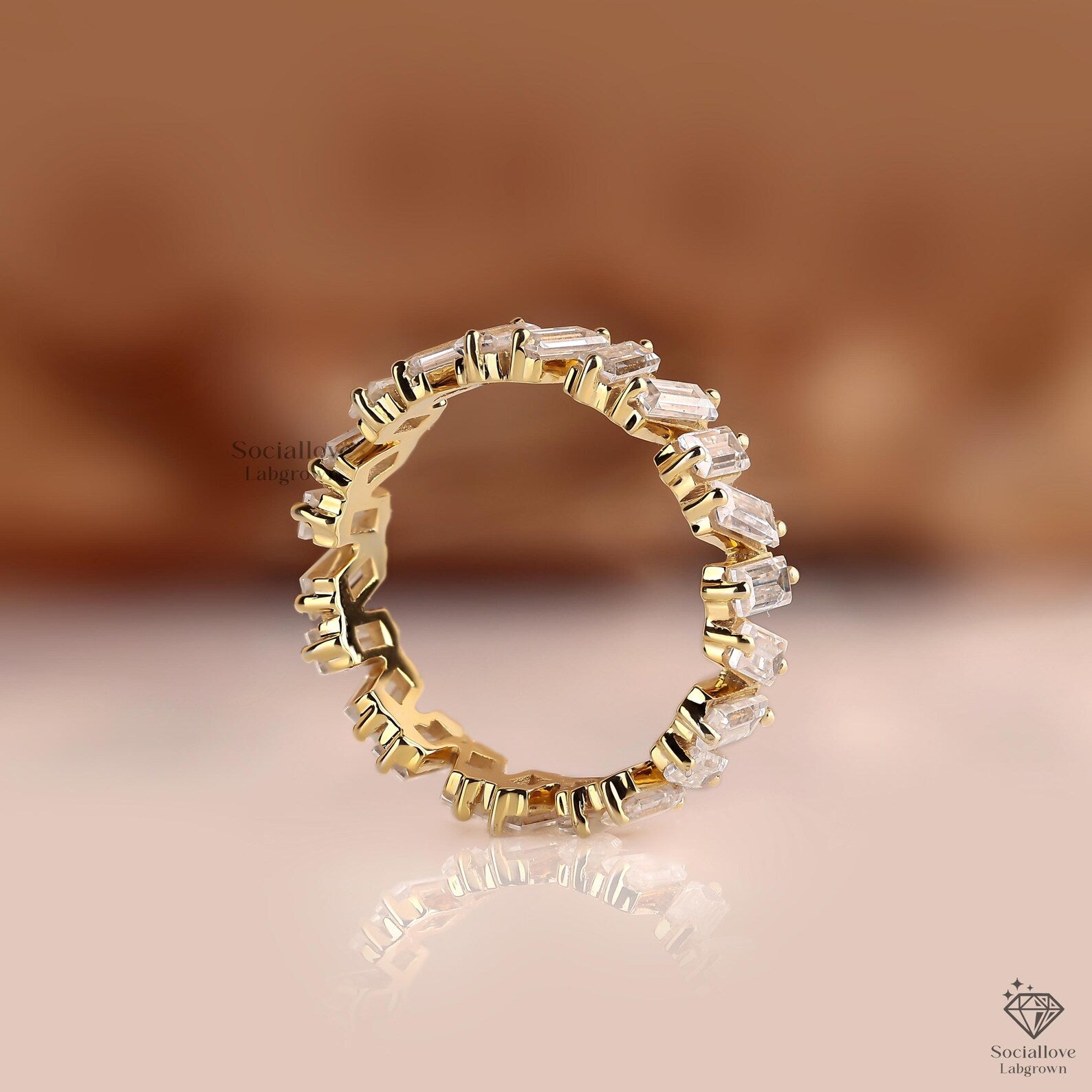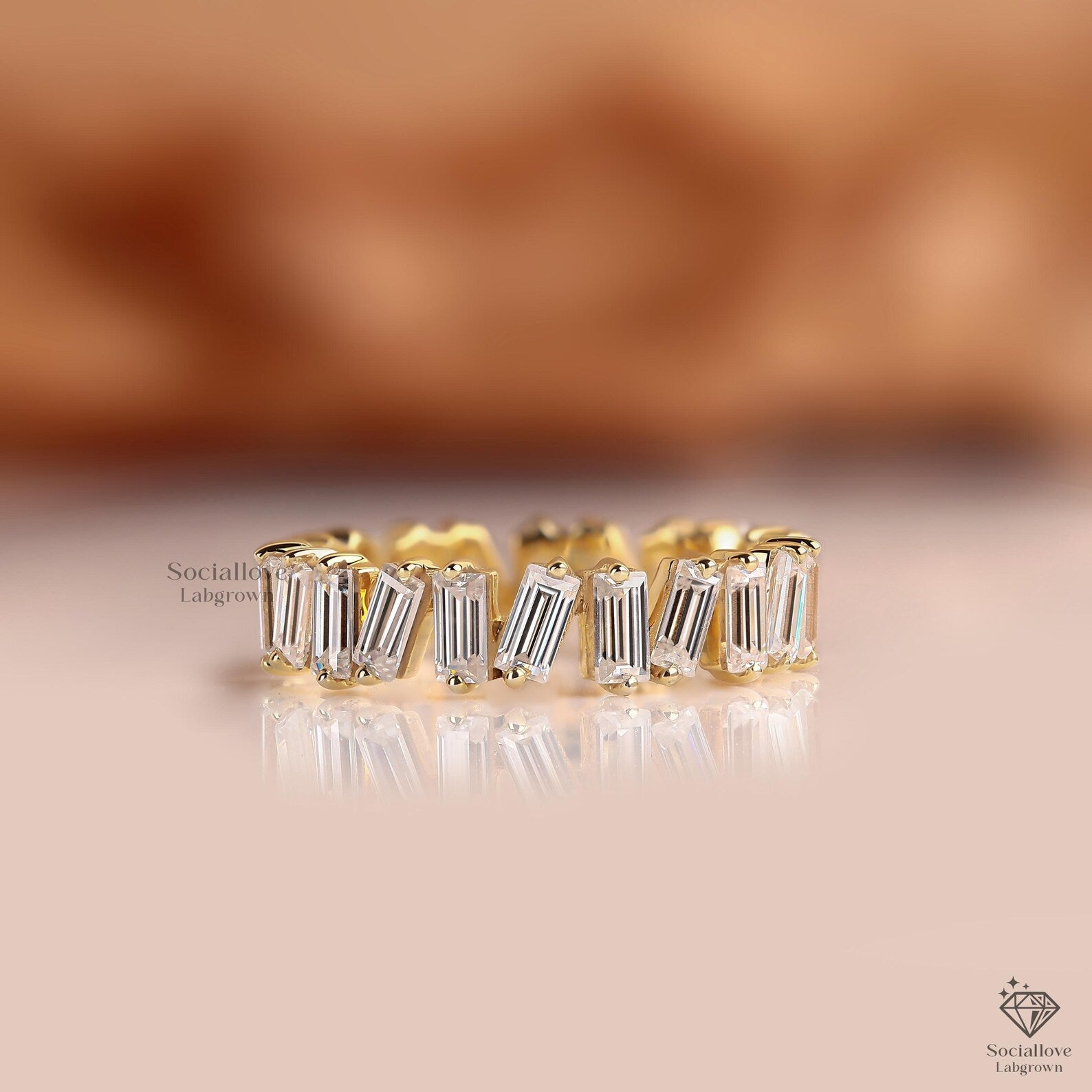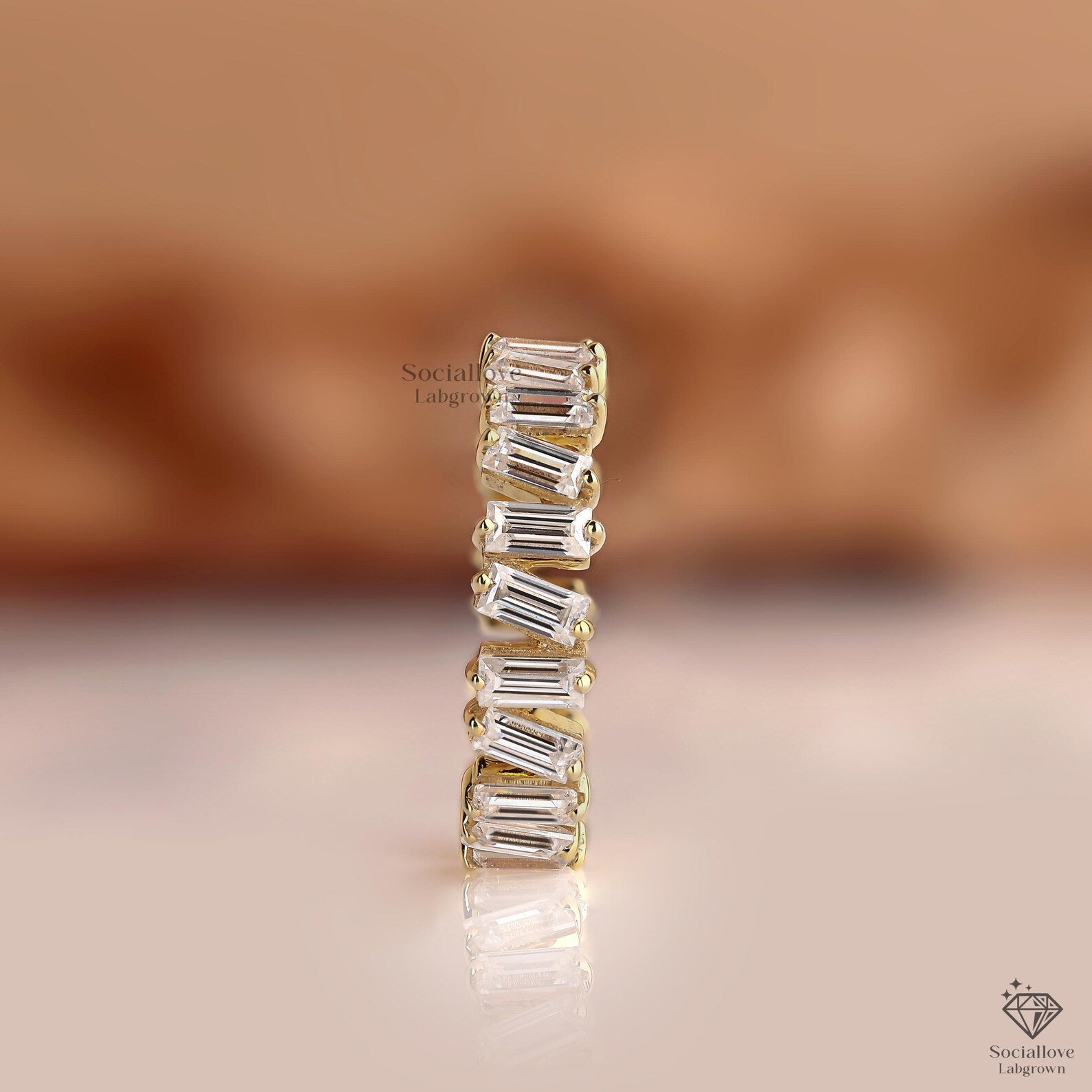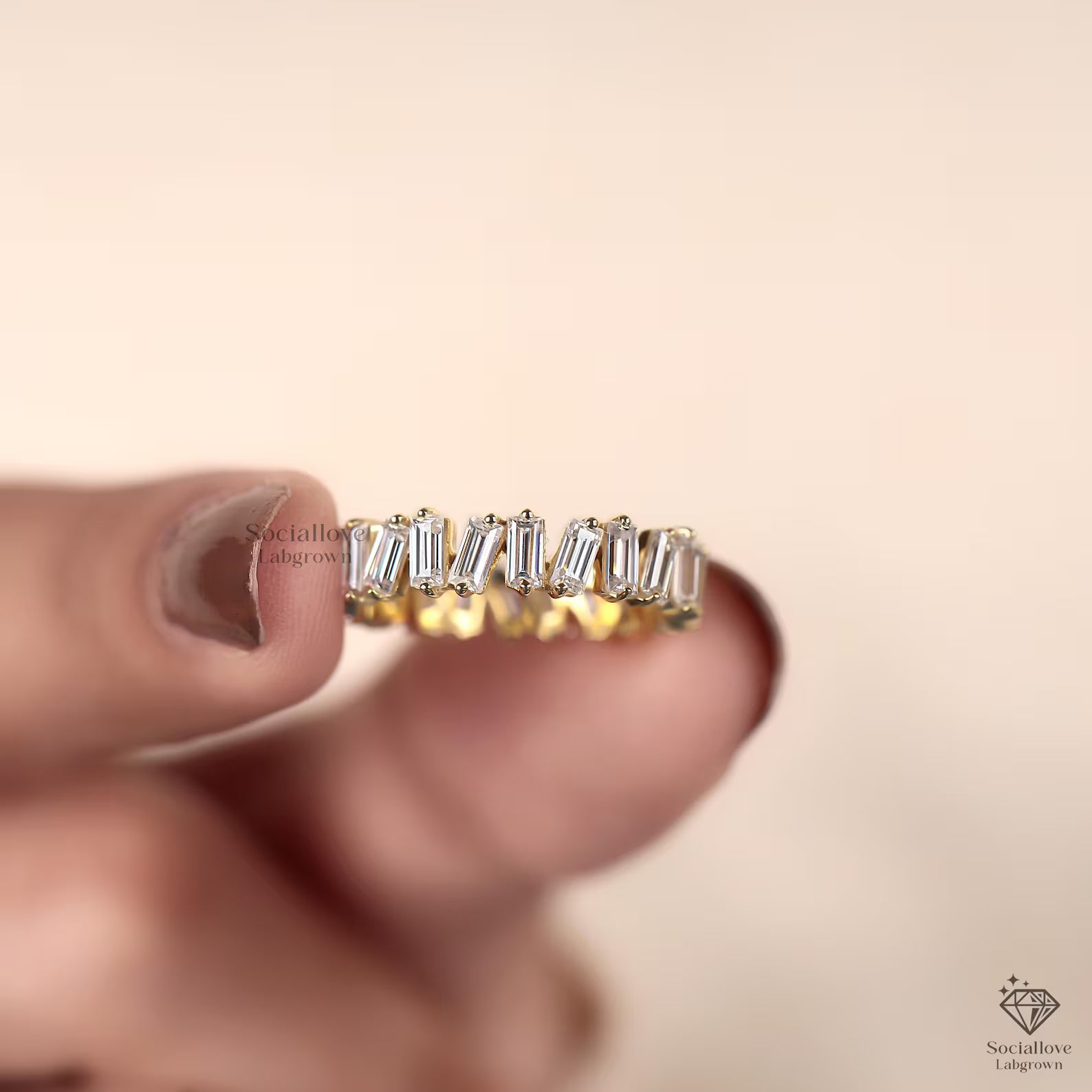 This dainty baguette wedding band features bar-set lab grown diamonds in solid 10K to 18K gold. We use only E-F-G color and VS/VVS1 clarity stones, offering brilliant shine with a minimalist design. Perfect for everyday or special moments. Order today and make it yours!