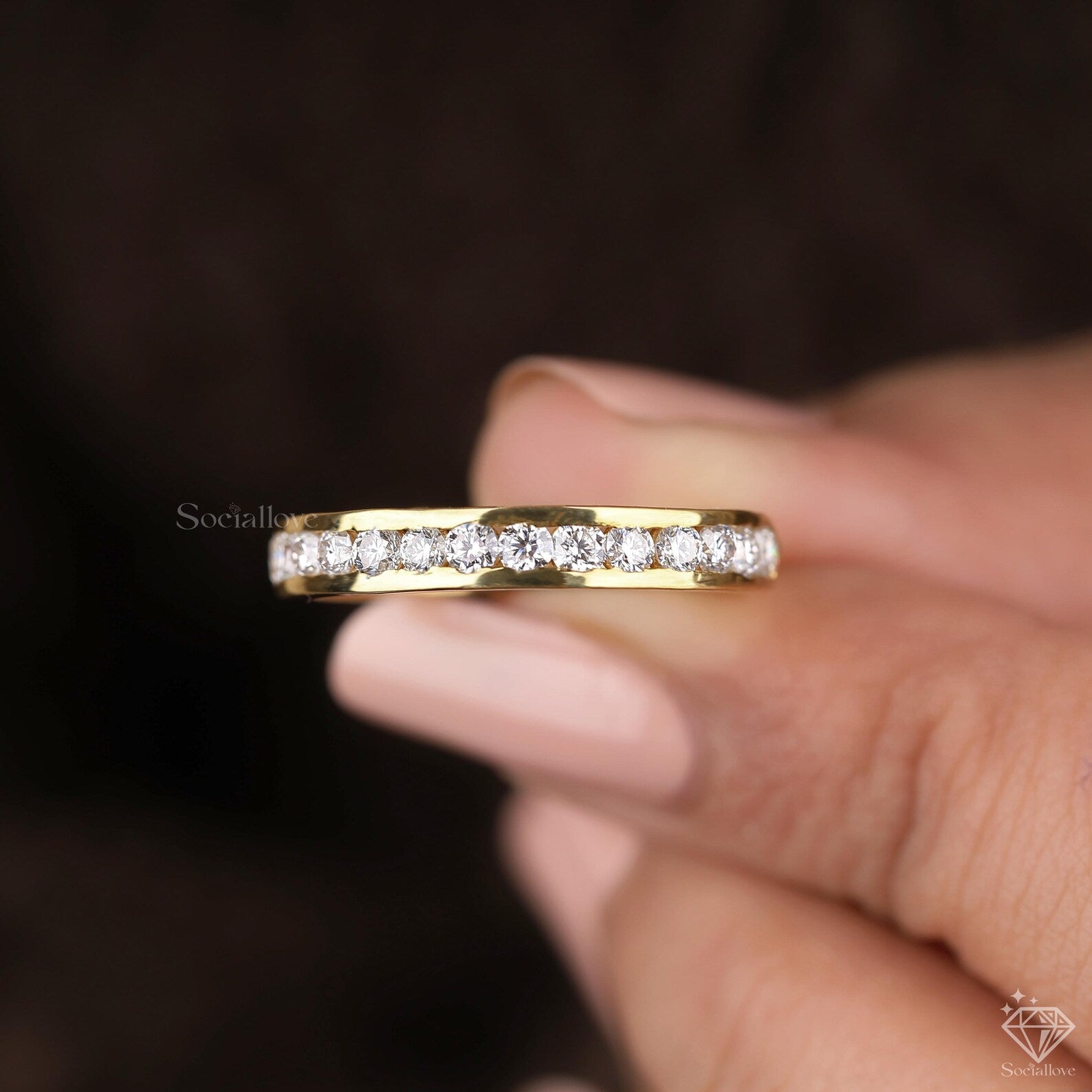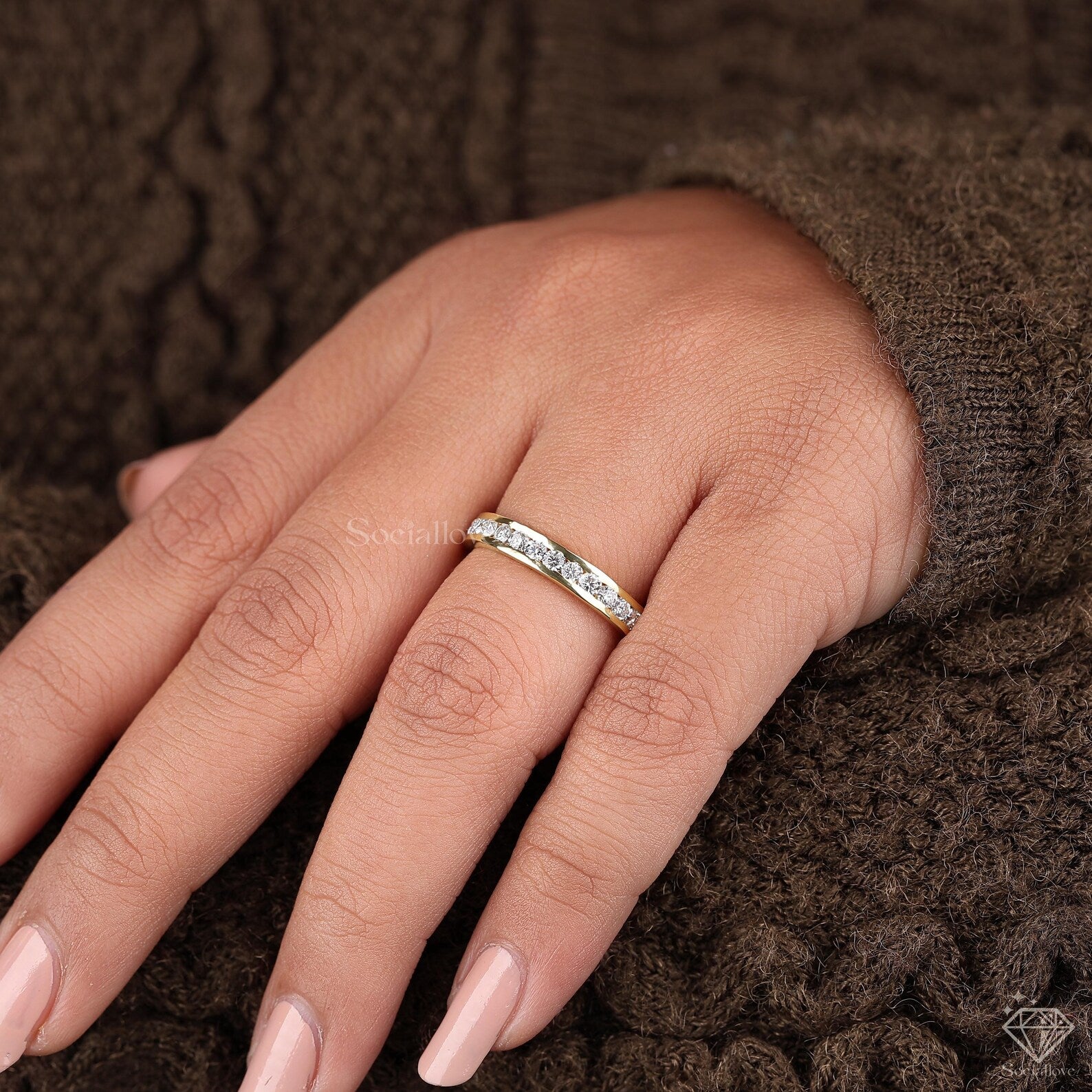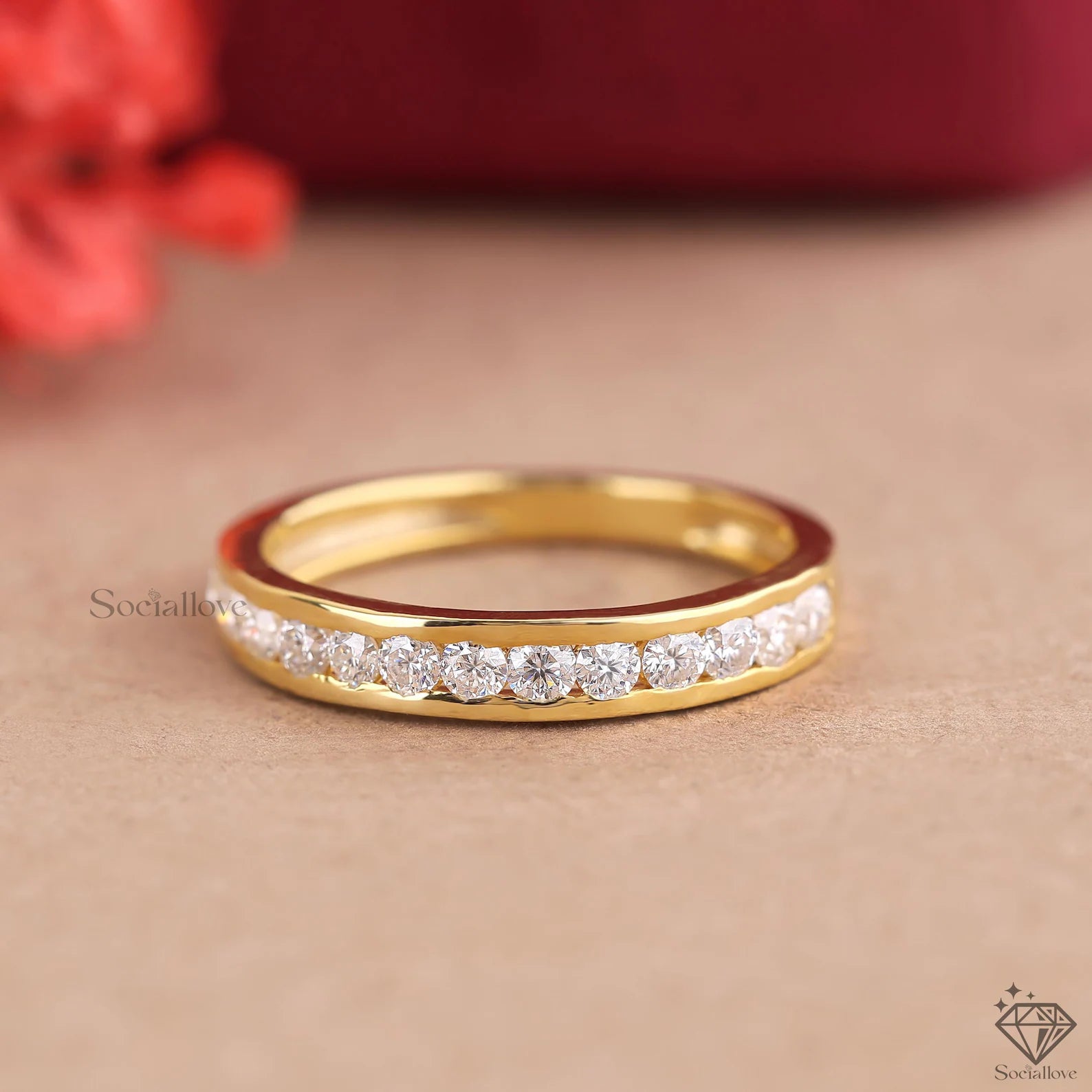 Round Lab Grown Diamond Half Eternity Ring | 14K Yellow Gold Channel Set Wedding Band Anniversary Gift for Women.