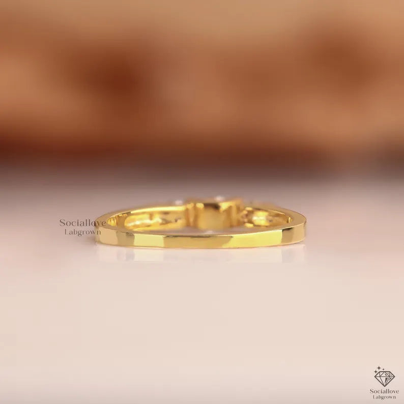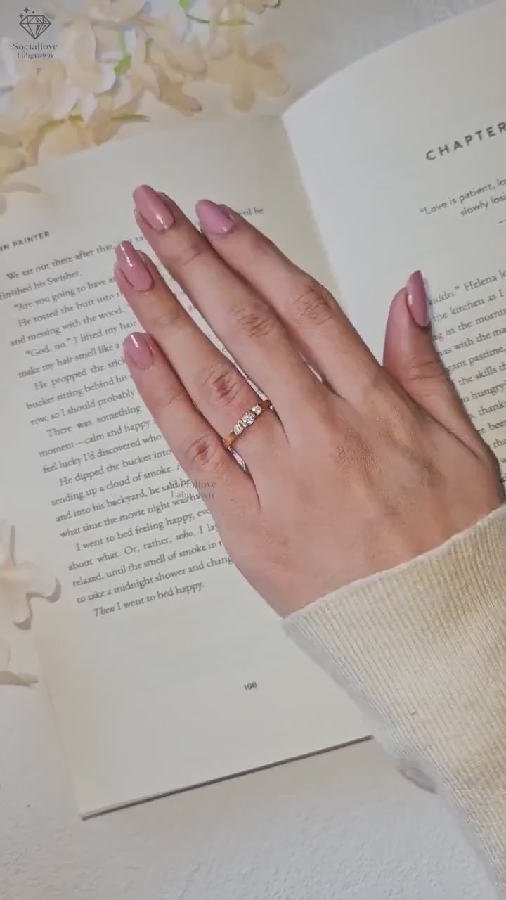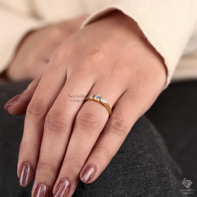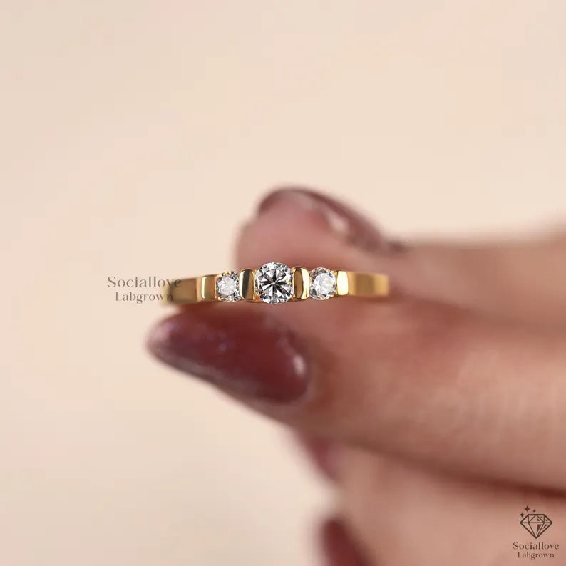 This dainty three-stone engagement ring features round cut lab grown diamonds in a bezel setting on a flat 14K yellow gold band. We use handmade E-F-G color diamonds with VS or VVS1 clarity, crafted in solid gold from 10K to 18K. A perfect promise or wedding ring. Order today!