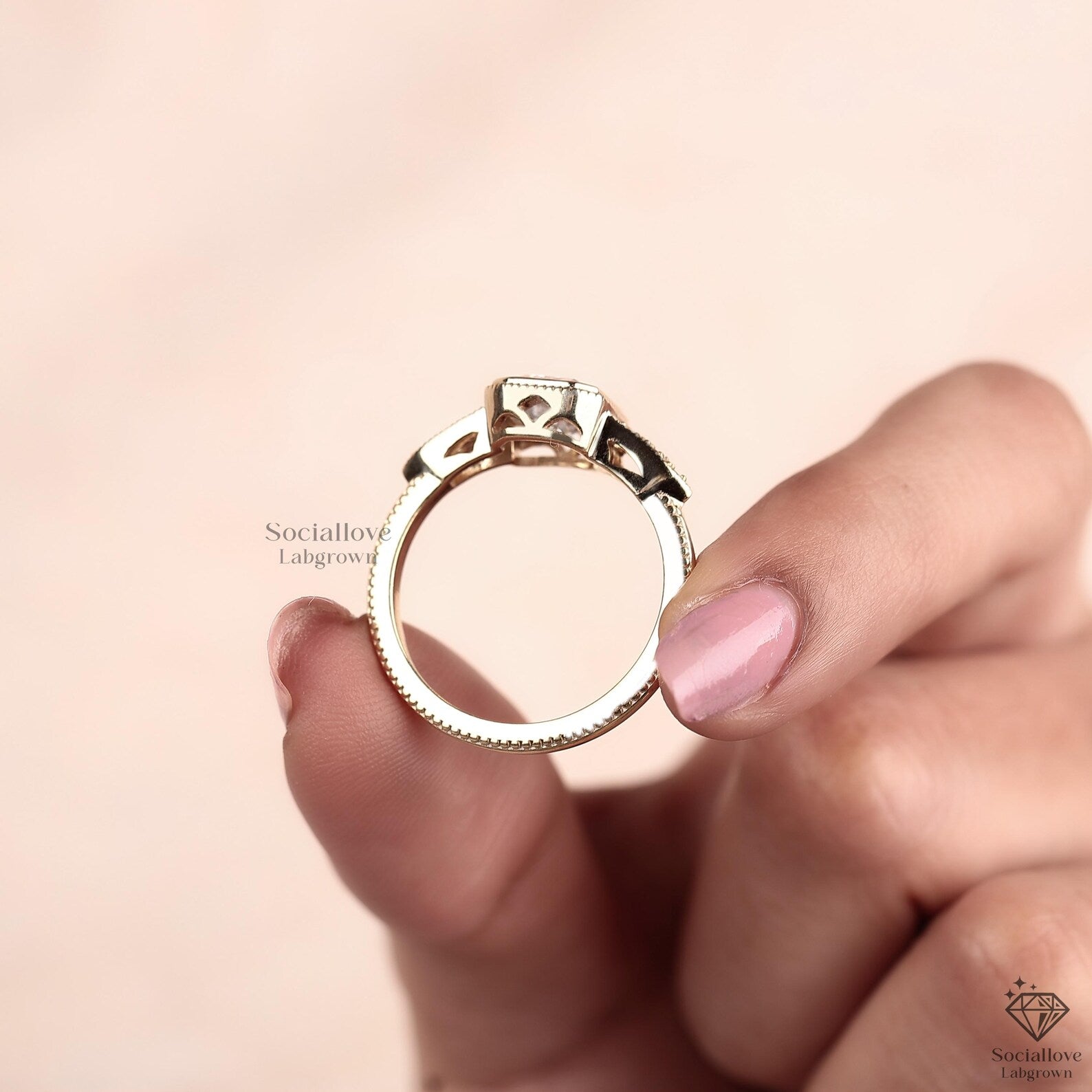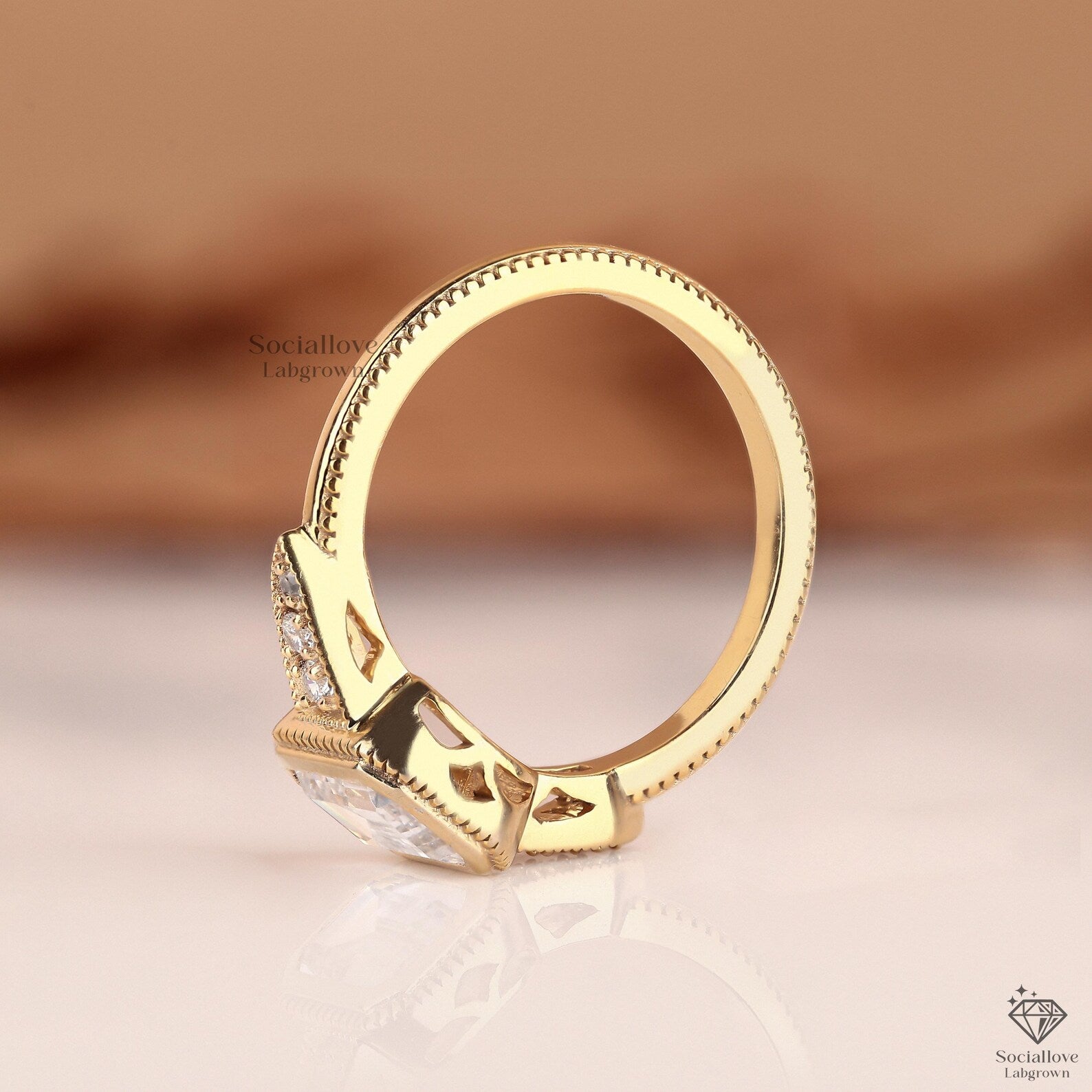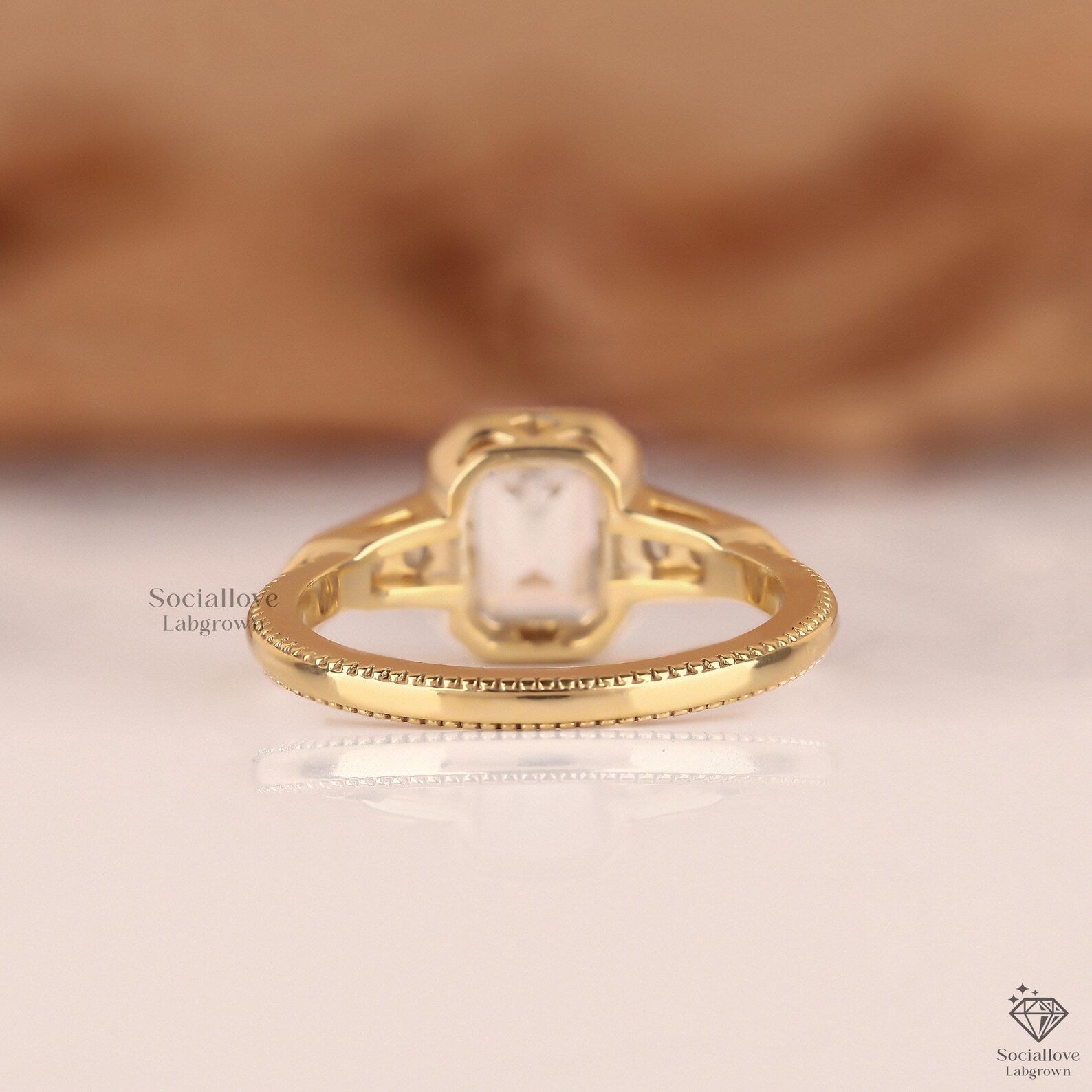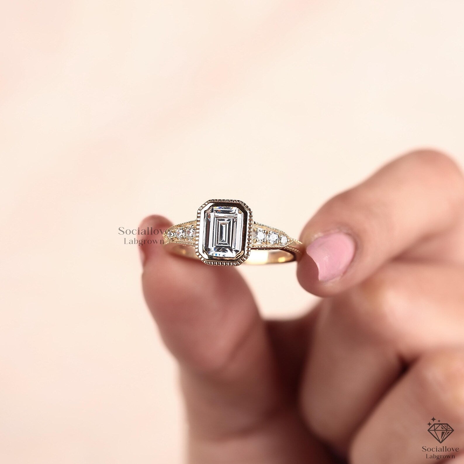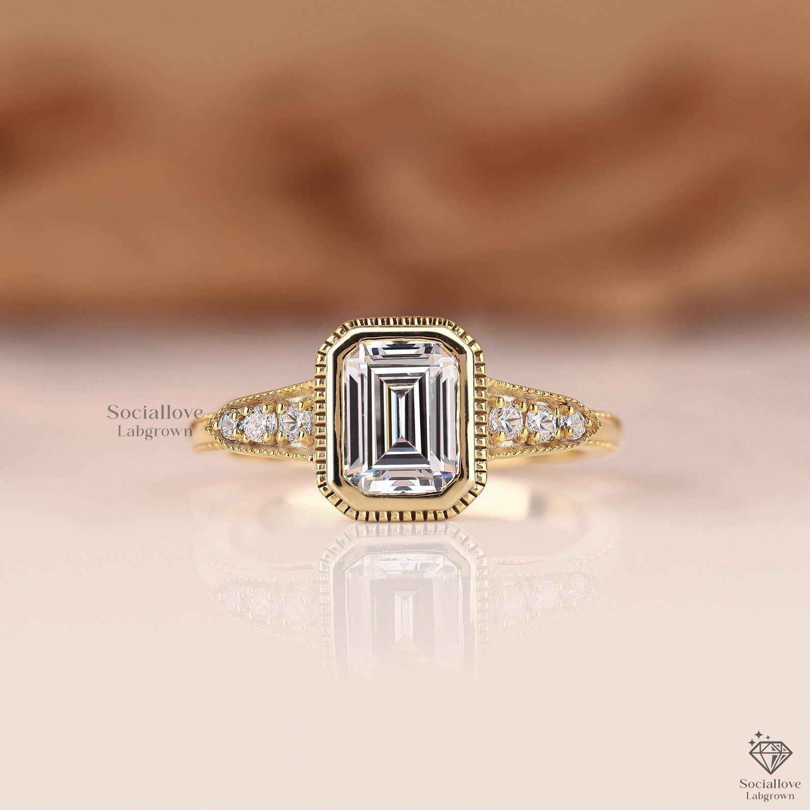 Timeless Glamour Vintage Art Deco Emerald Cut Engagement Ring Step back into the Golden Age of design with this spectacular Vintage Style Emerald Cut Engagement Ring. Inspired by the geometric sophistication of the Art Deco era, this ring features a dazzling Lab Grown Diamond, secured by a chic Bezel Set and adorned with intricate Milgrain detailing. It is a true heirloom piece that symbolizes enduring love.